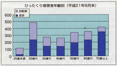 平成21年8月末現在、大阪府のひったくり認知件数は2,302件で、前年の同時期に比べて16件増加しており、60歳以上は徒歩(所持)、20歳代は自転車(前カゴ)による被害が増えています。